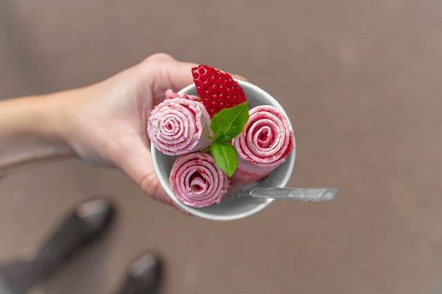 El comensal puede elegir entre diferentes ingredientes, como frutos rojos, durazno, granillo de chocolate, cereal, mango y frutas de temporada. Es un servicio con personal y con la posibilidad de ser interactivo, donde el comensal puede hacer su propia creación de helado en rollo.
