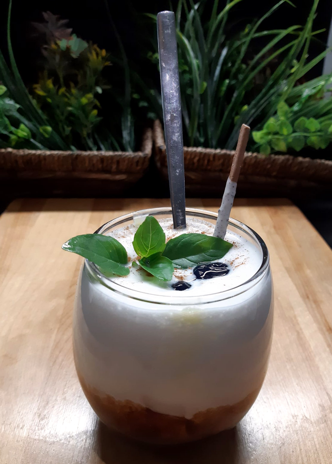 Copa de espuma de fomu en sifón, helado de vainilla espejo de hershey’s *Toppings* moléculas de frambuesa y pocky.