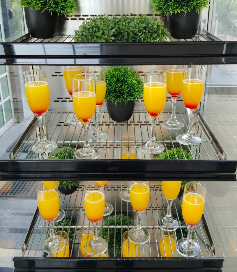 Agua Mineral, Jugo de naranja, Refresco de toronja, Jugo de arándano, Coca cola clásica, Ginger-ale, Sprite Zero, Agua natural, Coca cola Light, Agua Quina, Refresco de manzana y Hielo.