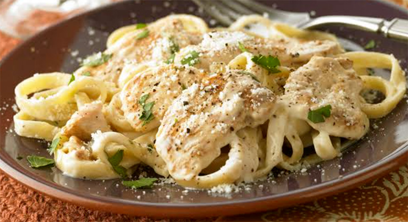 Pasta italiana al pesto, con queso parmesano y fajitas de pollo al grill